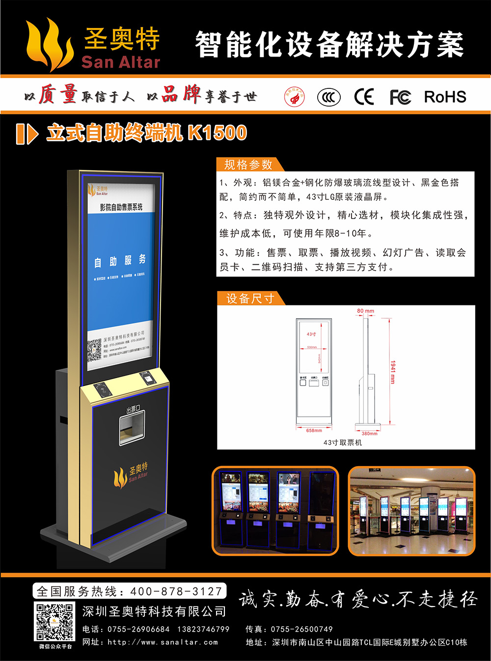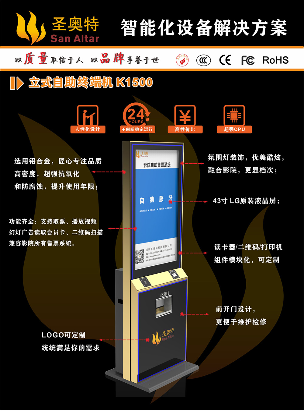 圣奧特K1500 立式自助終端機(jī) 廣泛應(yīng)用于:智慧影院 智慧景區(qū) 智慧場(chǎng)館 智慧醫(yī)院等