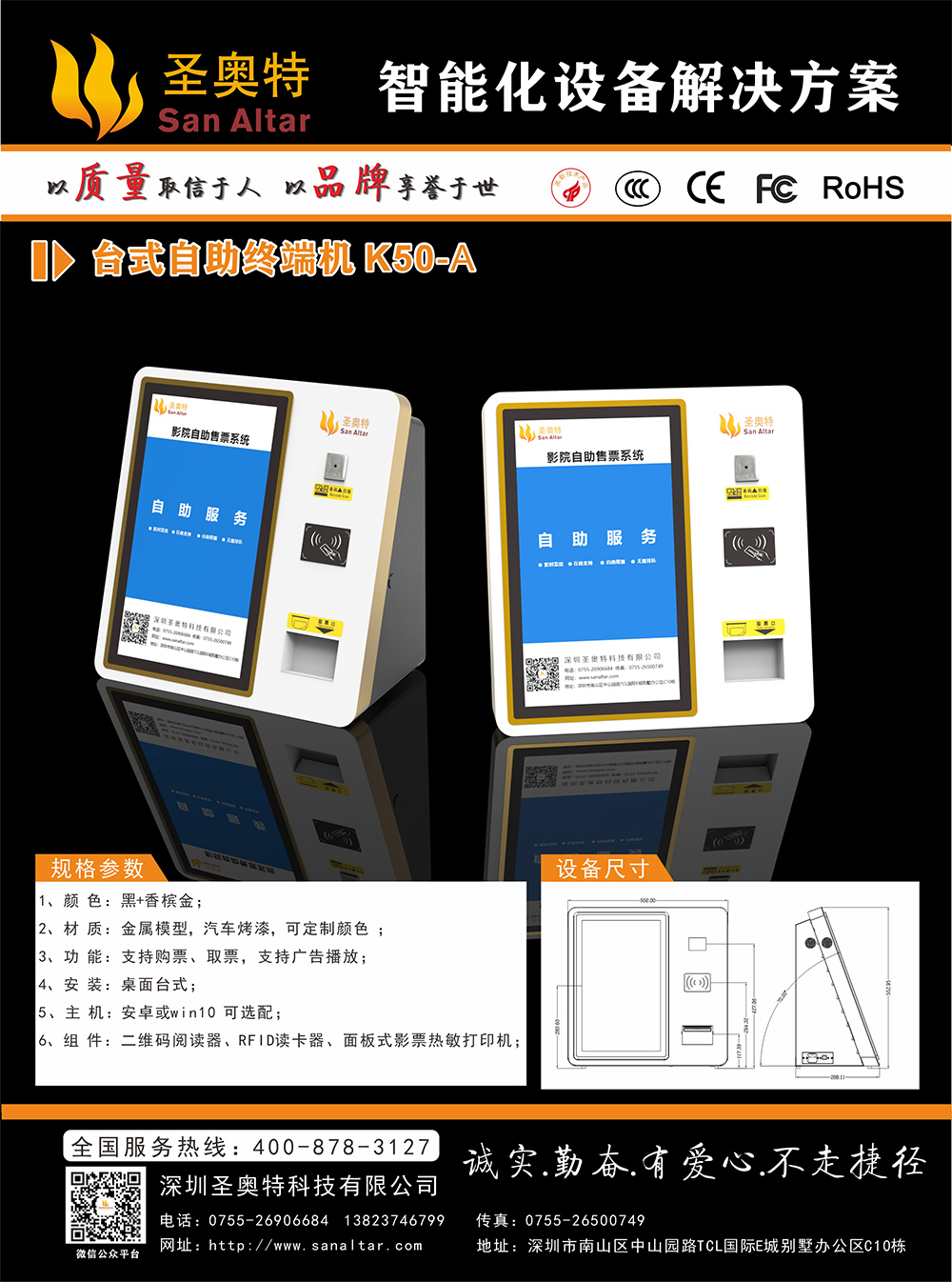 6、組 件:二維碼閱讀器、RFID讀卡器、面板式影票熱敏 打印機(jī);