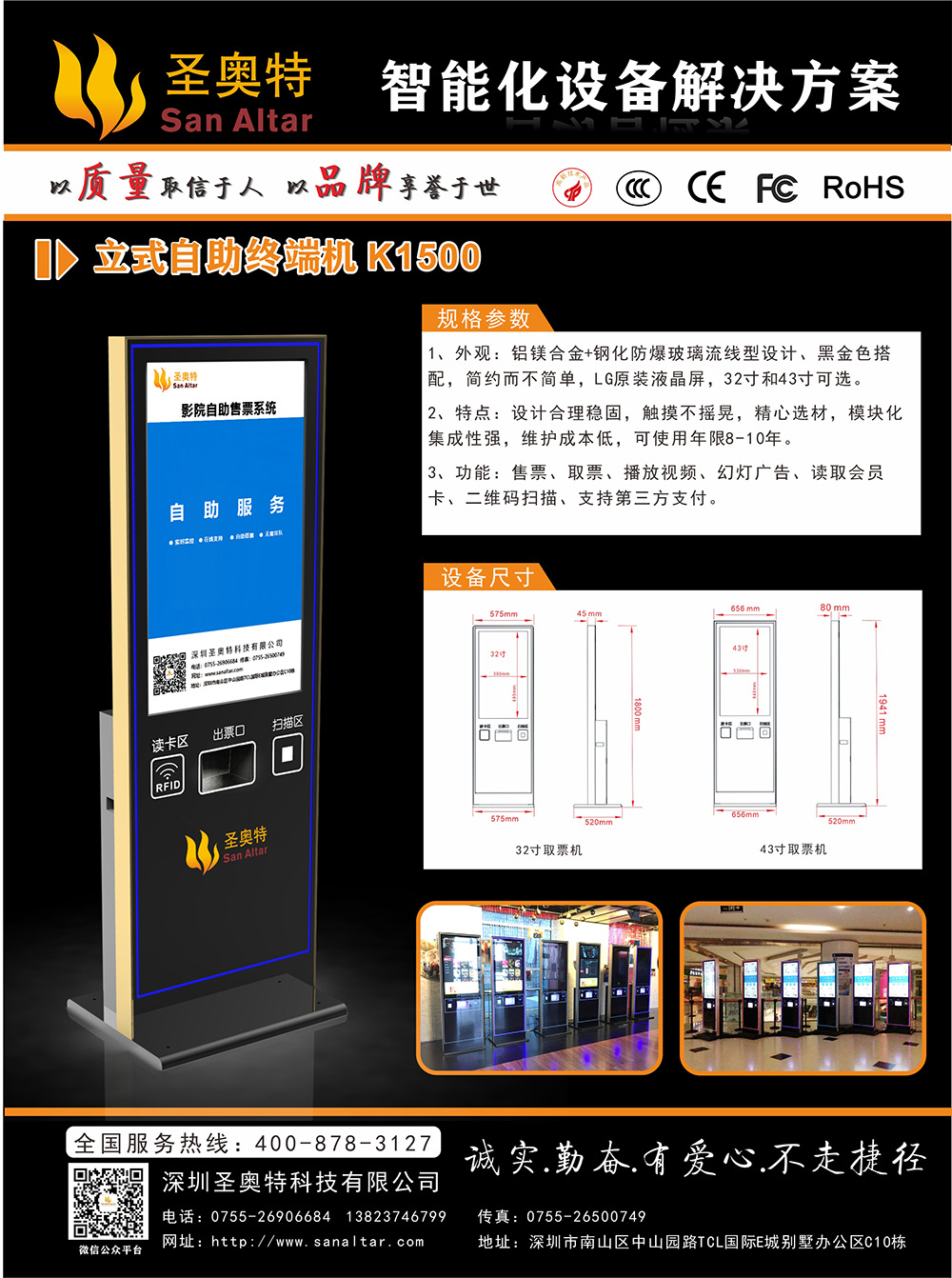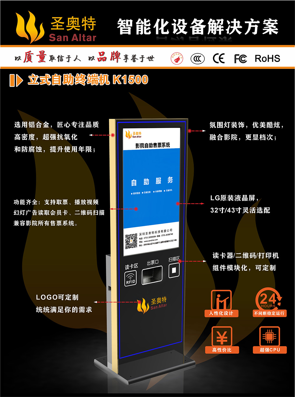 圣奧特K1500 立式自助終端機 廣泛應(yīng)用于:智慧影院 智慧景區(qū) 智慧場館 智慧醫(yī)院等
