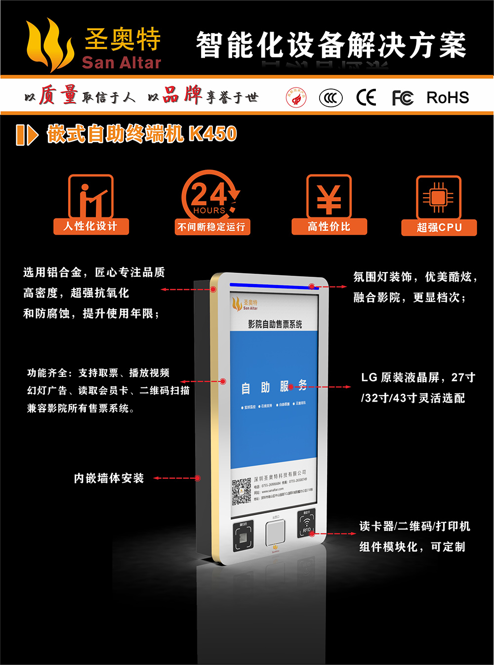 高清大屏、超薄體驗、嵌入式墻體安裝、自助終端
