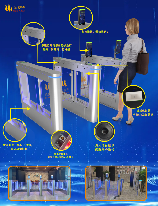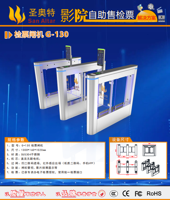 影院的高配置不光體現(xiàn)在放映和音響設(shè)備上,檢票設(shè)備同樣也是高端大氣的智能檢票閘機-圣奧特提供的G130款閘機。