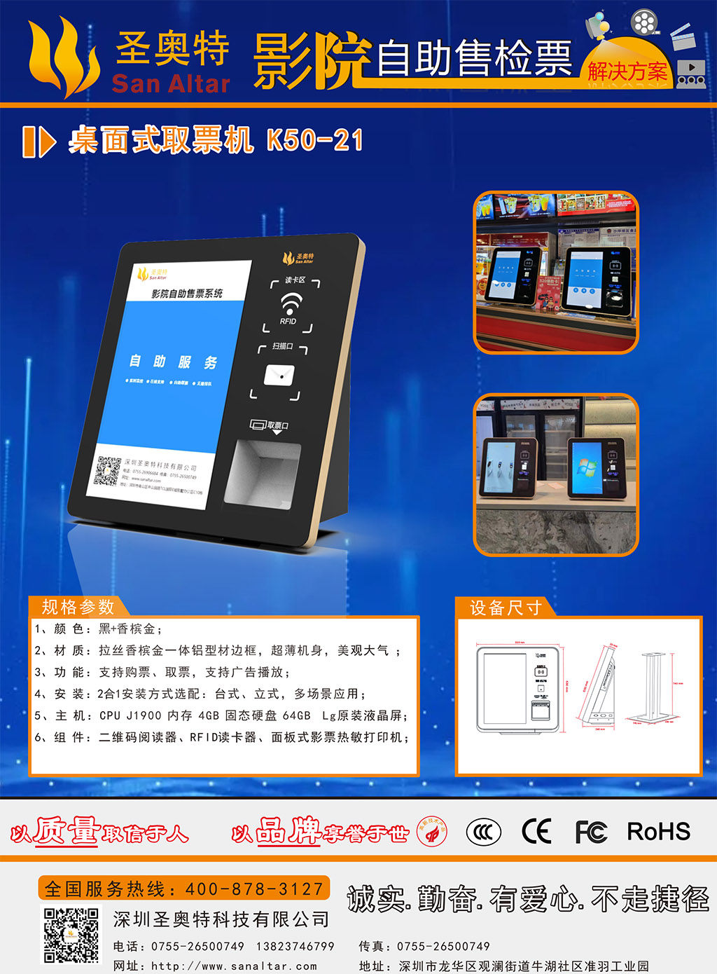 6、組 件:二維碼閱讀器、RFID讀卡器、面板式影票熱敏打印機(jī);